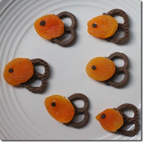 - Turn a mini chocolate chip upside down and press it into the apricot to make an eye for your fish.