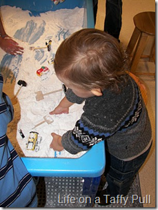 While Laffy Taffy isn’t doing dishes here {he’s using an ice cream scoop to tranfer snow}, it reminds me that sometimes the simplest activities can be so much fun for tots! Pull up a stool and let your little one wash the dishes or some toys for fun!
