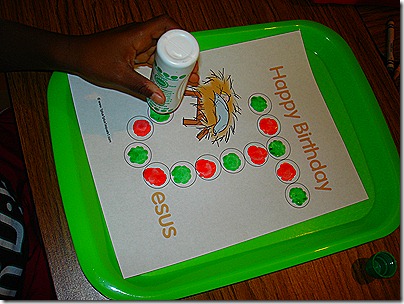 Do-a-Dots: We switched it up a bit and rather than using our homemade puff balls, the boys used Do-a-Dot markers on their Happy Birthday Jesus page. We added in a bit of patterning by using both red and green markers.