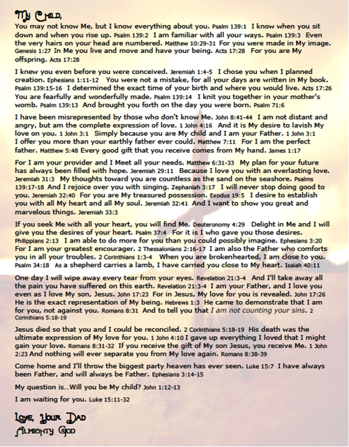 p.s. If anyone would like a copy of the Father’s Love Letter let us know and a copy will be emailed to you in PDF format.