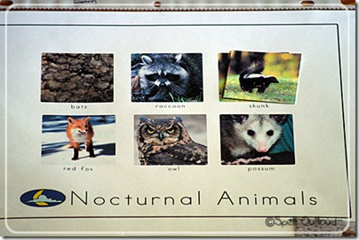 Then we practiced matching the correct animals onto the right mat. After we had done that activity several times (over a course of a couple days) we sorted the whole collection of animal counters on the day/night mat. You can find the downloads for this activity on my ABC page under the Letter N printables.