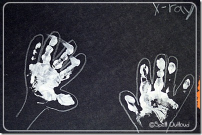 Learning about x-rays and our bones fit in perfectly with all the anatomy lessons I was doing with my older children. I came across this cute idea of making your own x-ray with handprints from The Homeschool Den. My girls had so much fun painting their hands and making handprints. We actually did prints on various colors of paper because they just couldn’t stop. :) After the handprint dries, outline with chalk.